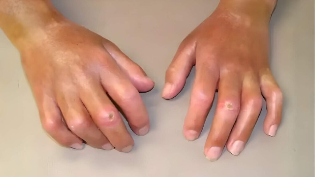 Skin tightening, ulcers, and pigmentation changes may require dermatological care.